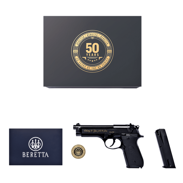 To celebrate 50 years of the legendary 90 Series, Beretta releases the 92SB Repro. A limited-edition reproduction of the third model in the iconic lineup. Featuring "Celebrating 50 Years of the 90 Series" engraved on the slide and a unique serial number, only 1,526 units will be produced; polished anodized frame, polished blued slide and barrel; rounded trigger guard; flat dust cover; G10 grips; all-metal components and upgraded internals like the short reset trigger bar and D hammer spring. Each pistol comes in special collectors packaging, challenge coin and a history booklet chronicling the 90 Series legacy. Includes two 15rd magazines and flat base plate.