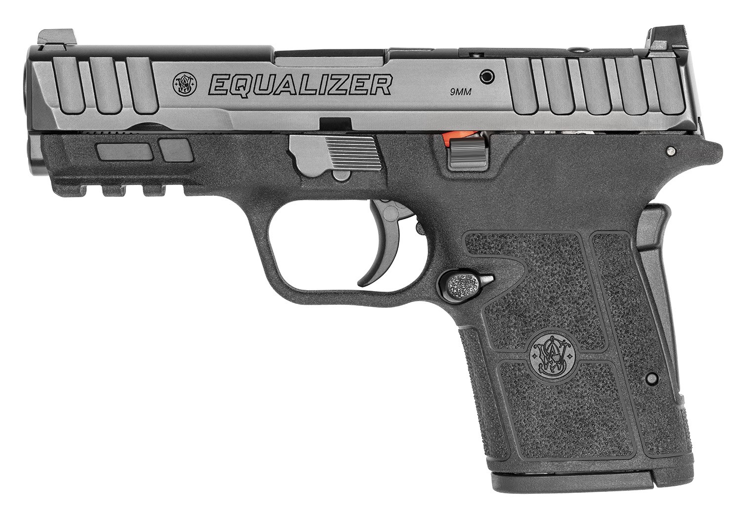The Equalizer is a S&W high-capacity, micro-compact. The pistol features an easy to rack slide with deep slide serrations, front and back; slide is cut for optics; fires 10rd magazine, 13rd magazine or a 15rd magazine; grip safety; no manual thumb safety; loaded chamber indicator; SA trigger with tactile and audible reset; Drift adjustable, white dot sights; Picatinny style rail; disassembles without pulling the trigger and an Armornite corrosion resistant finish. Includes 3 magazines and Aglula UpLula speedloader.