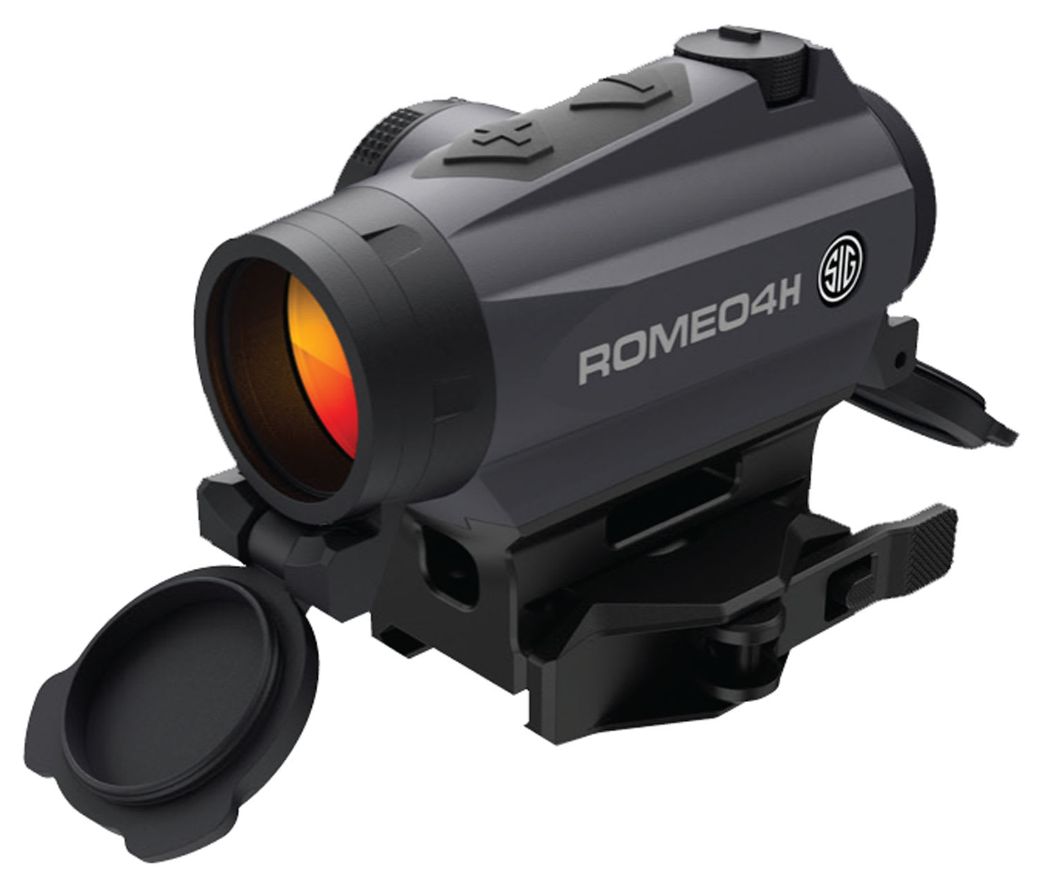 Sig's Romeo4H Compact Red dot is designed for modern semi-auto pistols, MSR platforms and shotguns. Features Ballistic Circle QuadPlex reticle. Features MOTAC Motion Activated Illumination System, unlimited eye-relief and red LED illumination for daylight visibility and extended runtime. Includes solid and see-thru lens covers and Co-witness QR mount and low mount.