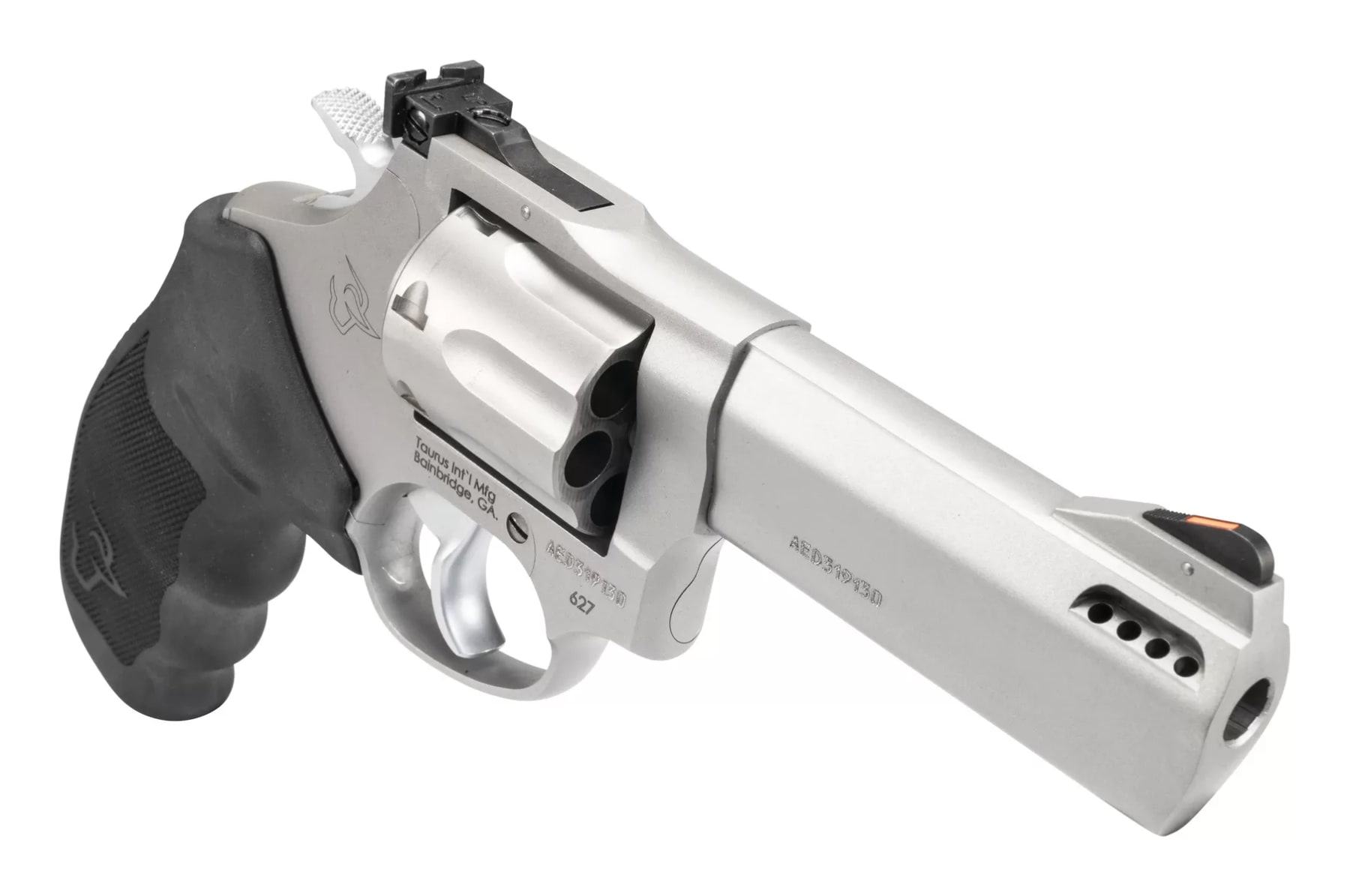 Extremely comfortable to fire and easy to control, the Tracker Series maintains a high level of accuracy, rock-solid performance, and near-indestructible construction. The Model 627 revolver 357 Magnum has a 7-round cylinder, and makes a practical choice for backpacks and tackle boxes, especially where there are bears and other predators around. It has a transfer bar safety as well as the Taurus Security System. The 627 Tracker features factory-tuned barrel porting and a gas expansion chamber for recoil, as well as the ergonomic, shock-absorbing Ribber grip. It has a matte stainless steel metal finish with a fixed front sight and adjustable rear sight. This model has a 4" barrel.